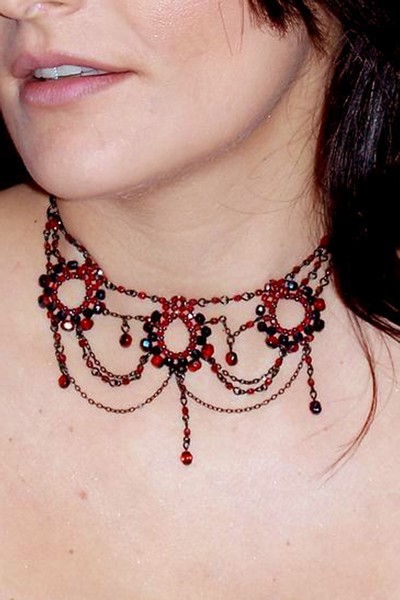 Luxusní černý náhrdelník ke krku nejen pro večerní příležitost. Ručně šitý z ohňovek a rokajlu na vlasci. Ověsy jsou naketlované na černých jehlách. Délka 30 cm + 10 cm prodloužení.