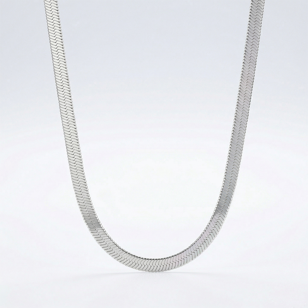 Plochý řetízek z chirurgické oceli. O délce 50 cm, šířce 0,4 cm, zapínání na karabinku.