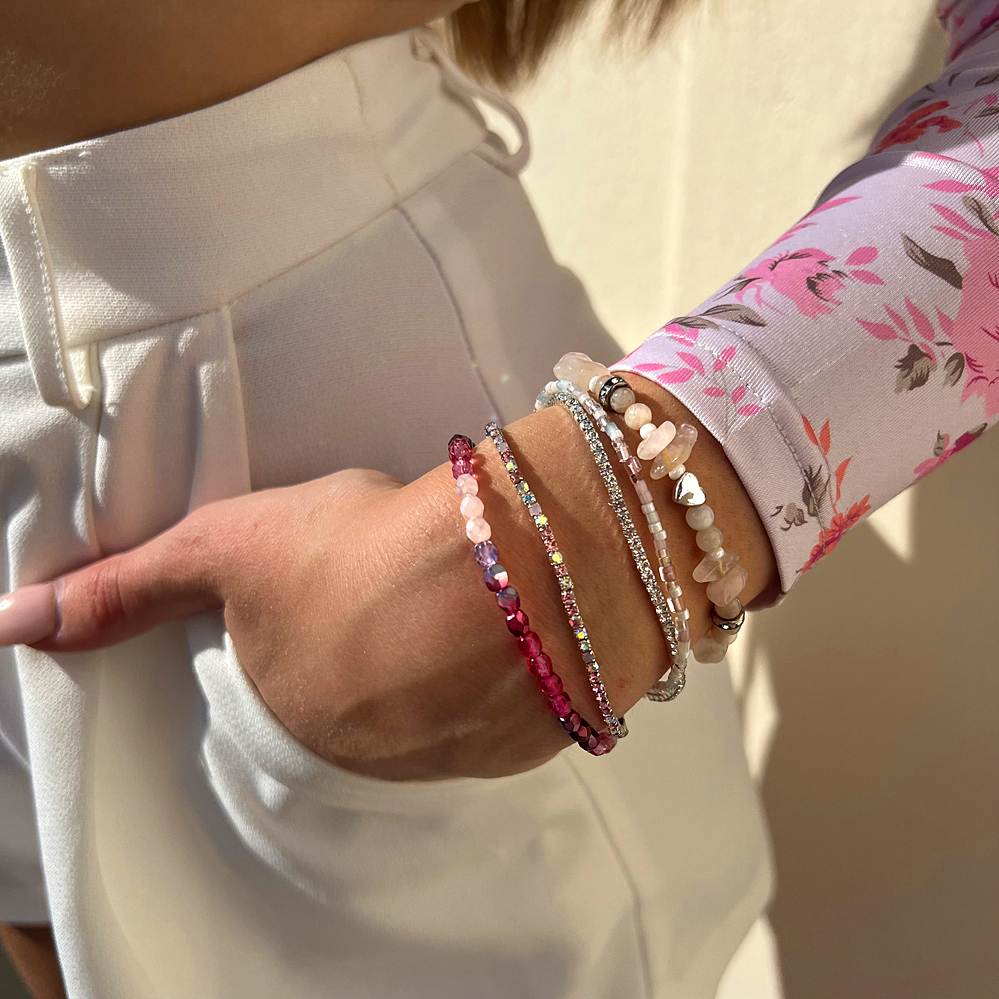 Jemný náramek z broušených českých skleněných korálků v růžových a fuchsiových tónech. Korálky se krásně třpytí. Navlečený na pružné gumičce pro pohodlné nošení. Zasíláme velikost (M) - 18 cm pro normální zápěstí. O změnu velikosti náramků si napište do poznámky v košíku - rádi Vám ji upravíme na míru.