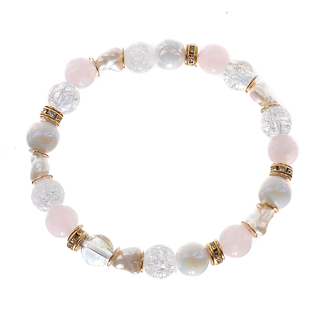 2x minerální náramek – růženín a křišťál na pružné gumičce, doplněné kovovými detaily