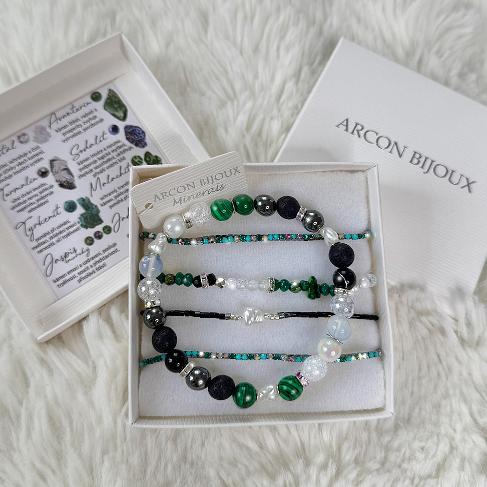 SET luxusních náramků z mnerálů – Smaragdové tajemství – 2 ks náramek z minerálů, 2 ks jemný štrasový náramek a 1 ks náramek z rokajlu Preciosa.