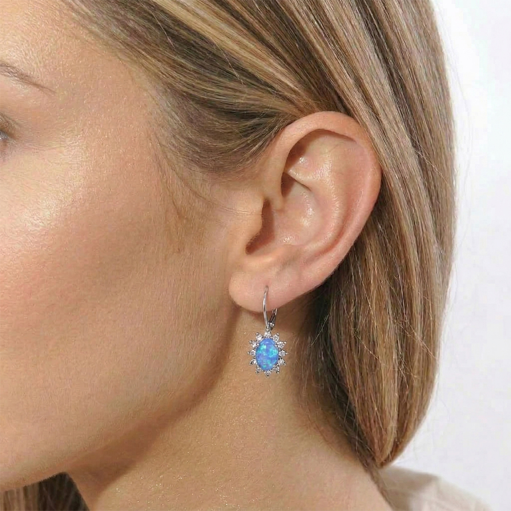 Visací náušnice s tyrkysovým kamenem z chirurgické oceli poseté kamínky. Lehké do uší, rozměr oválku 1 cm., celková délka náušnice - 2,5 cm. Šperky z chirurgické oceli jsou hypoalergenní, barevně stálé, odolné vůči oděru a oxidaci.